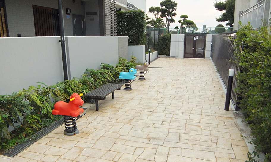 落ち着きのある住宅エリアに、スタイリッシュな外観。 エントランス エントランスホール 駐車場 駐輪場 宅配ボックス メールボックス ゴミ置場 共用通路