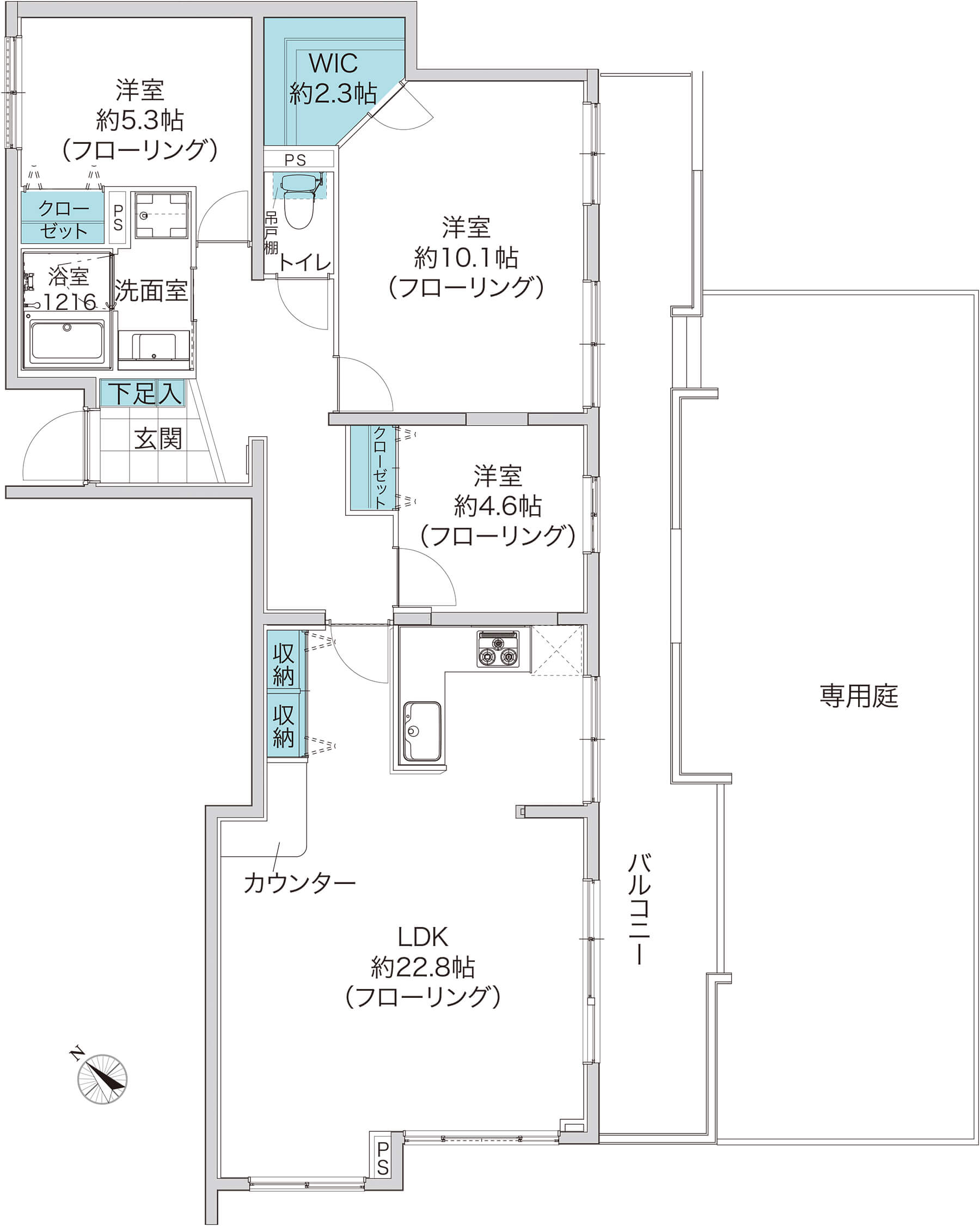 バルコニーも大きく、戸建てのように住むことができます。LDKは約22帖とひろびろとした空間となっています。